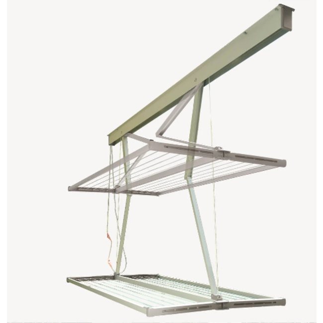 Na gebruik verdwijnt hij bijna onzichtbaar in zijn plafondprofiel, wat ruimte en tijd bespaart. Hij kan traploos worden verlaagd (tot 120 cm) dankzij de praktische treklijn met de innovatieve versnelling en blijft onafhankelijk op elke hoogte gefixeerd. Afhankelijk van uw wensen heeft u de keuze uit circa 9 of circa 18 meter drooglengte. En is ook geschikt voor grote stukken wasgoed.